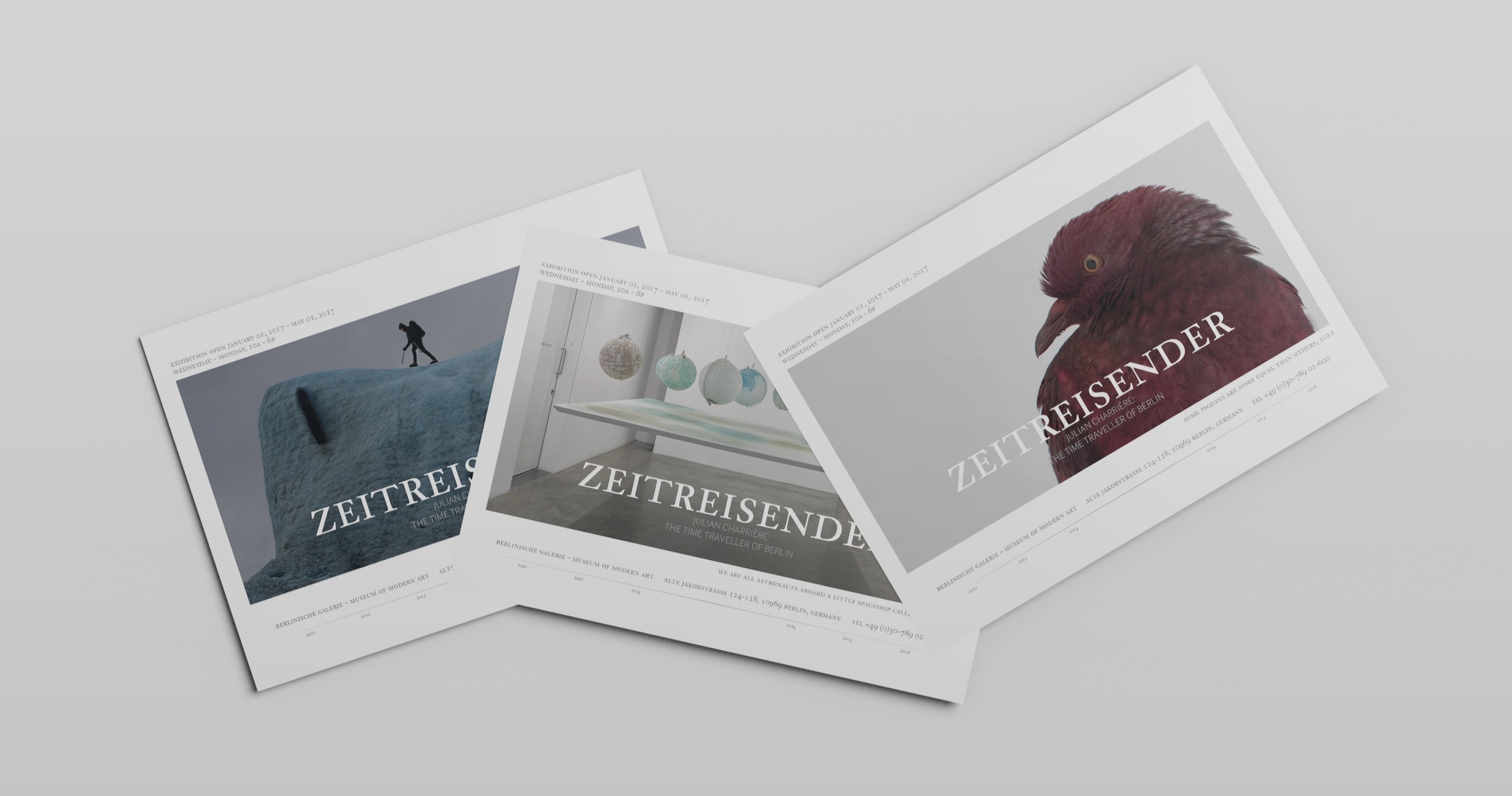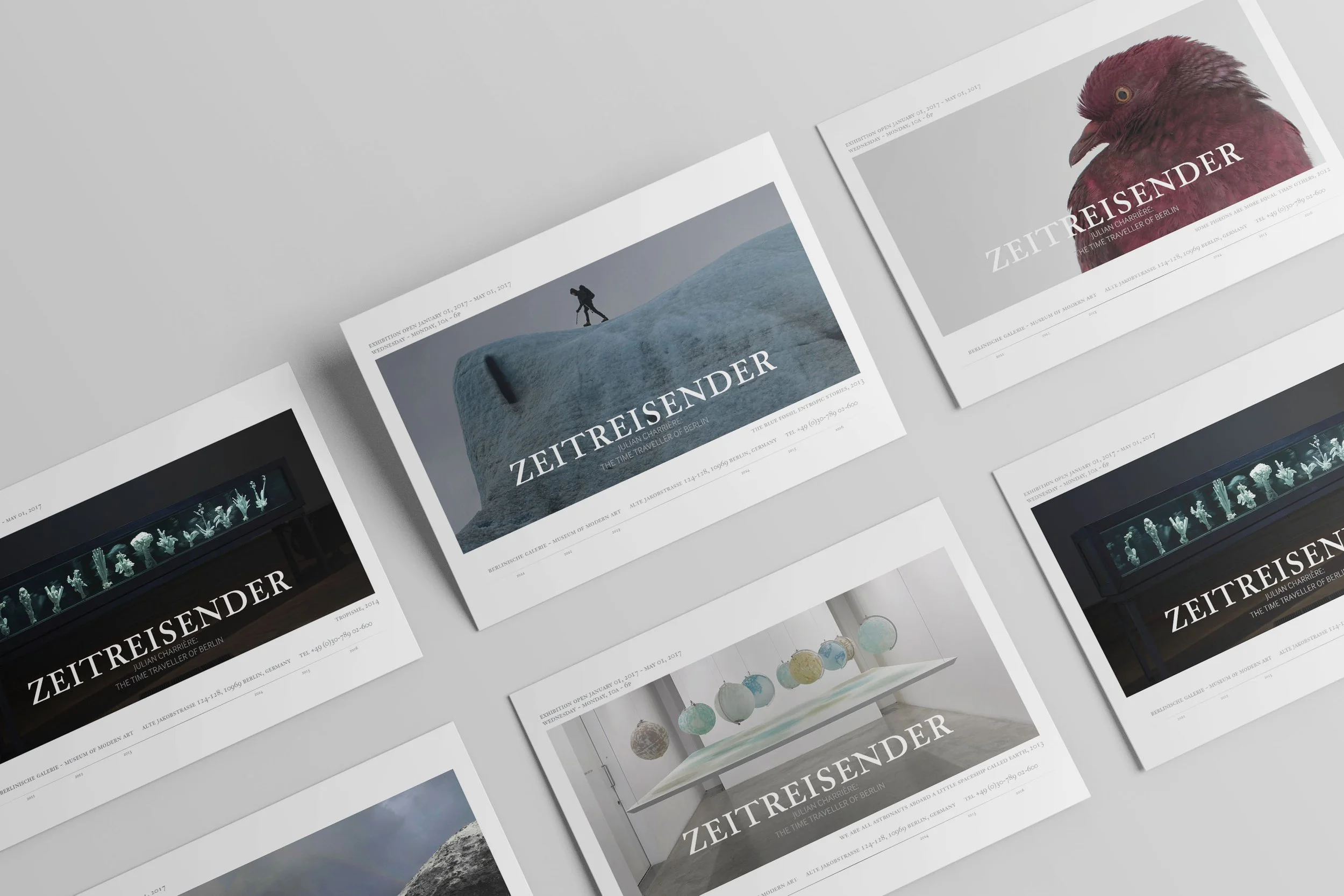 Zeitreisender – Julian Charrière: The Time Traveller of Berlin was an exhibition highlighting Charrière’s most provocative works between 2011 and 2016, spanning photography, performance, sculpture, and video. Charrière's incredible work bridges the realms of environmental science and anthropology through the use of photography, performance, sculpture, and video. After researching the artist and his practice, I handled copywriting and design for the exhibition’s collateral, which included posters, invitations, banners, brochures, and a 29-page catalog.